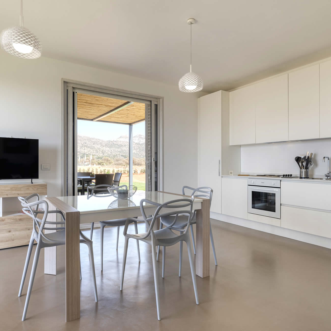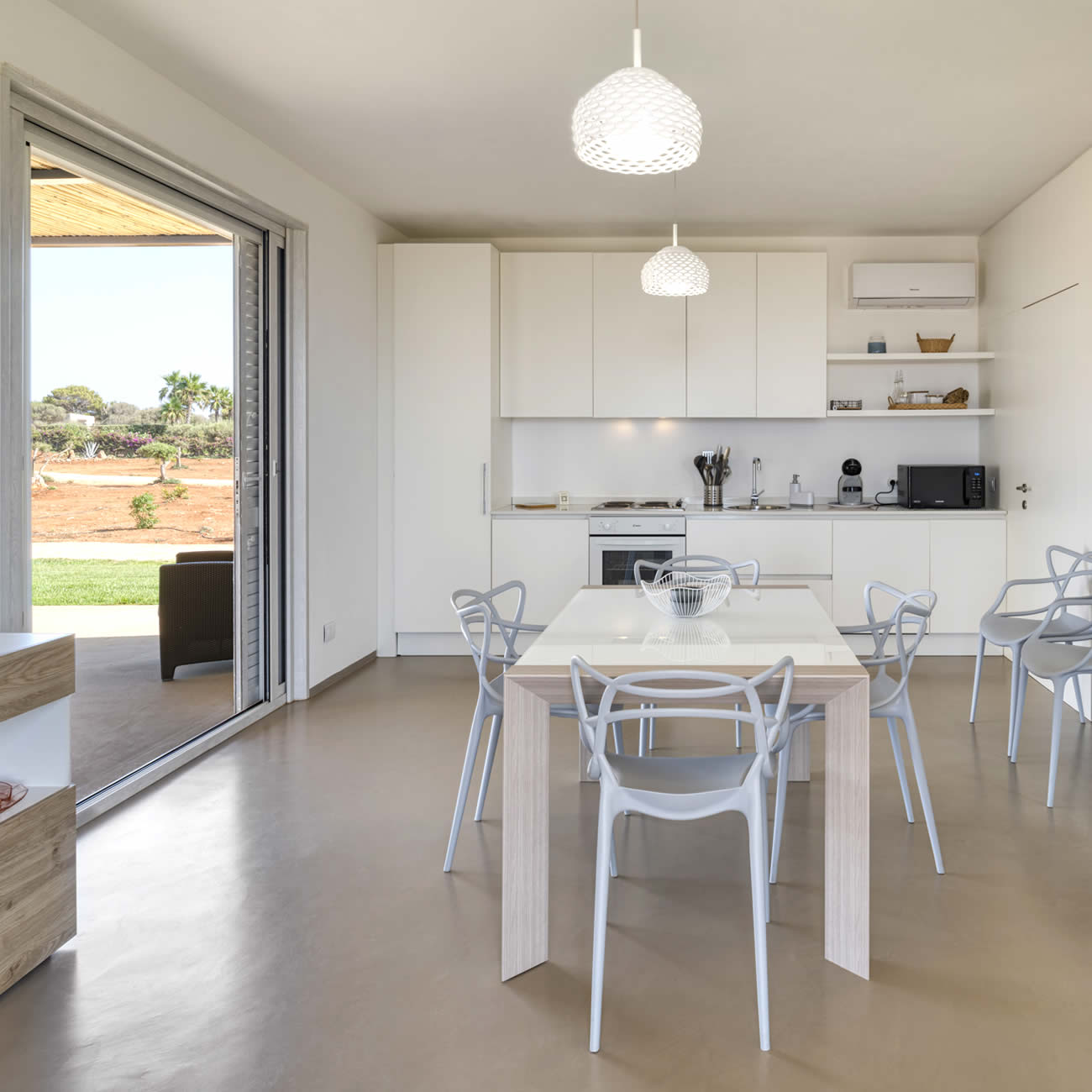 Le grandi porte-finestre, dotate di zanzariere, permettono alla luce naturale di riempire l'ambiente, creando un collegamento diretto con il giardino circostante e invitando gli ospiti a godere della vista sul verde esterno.