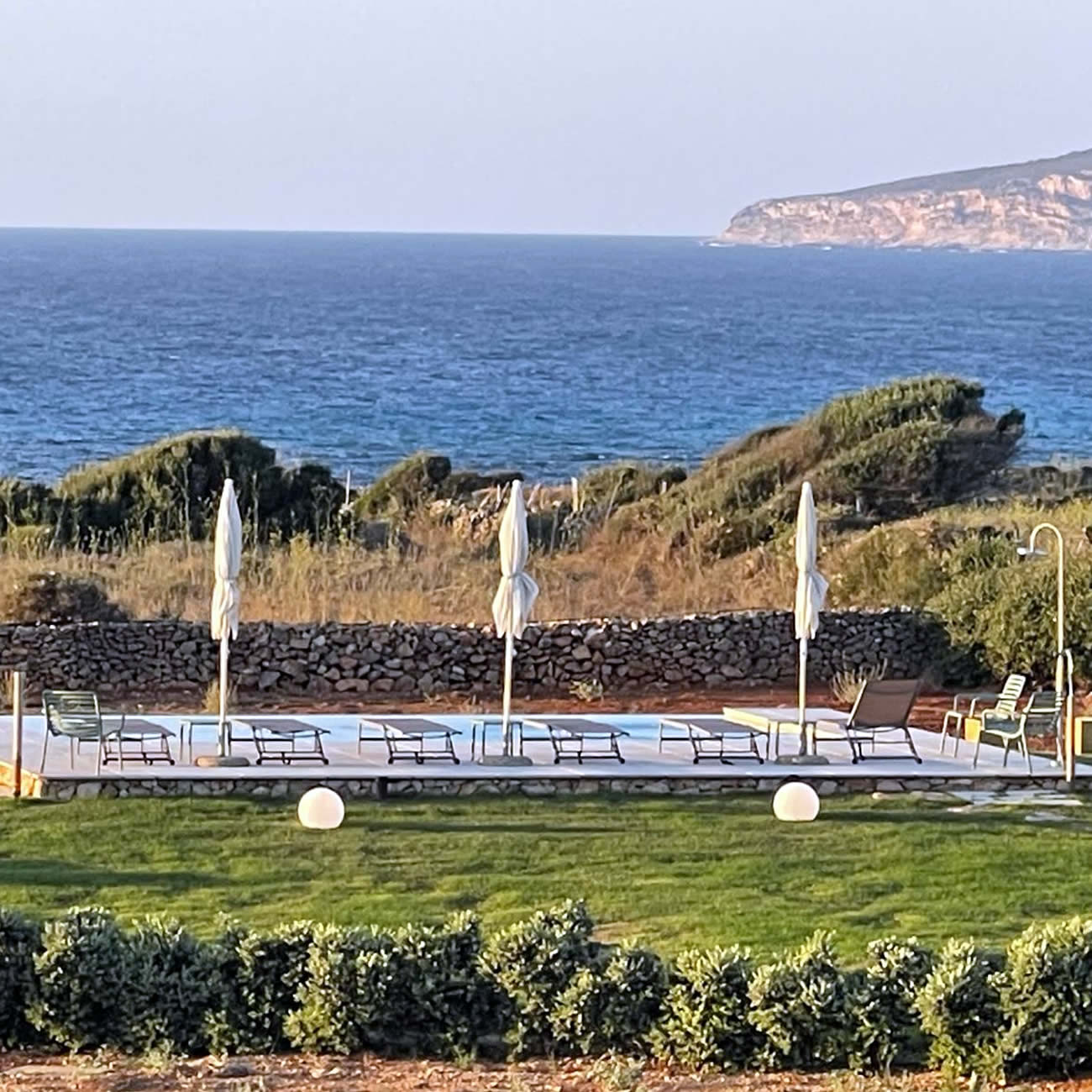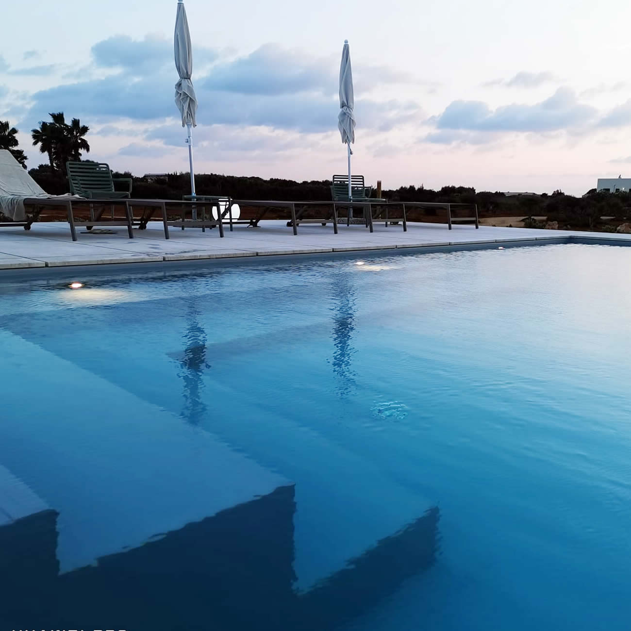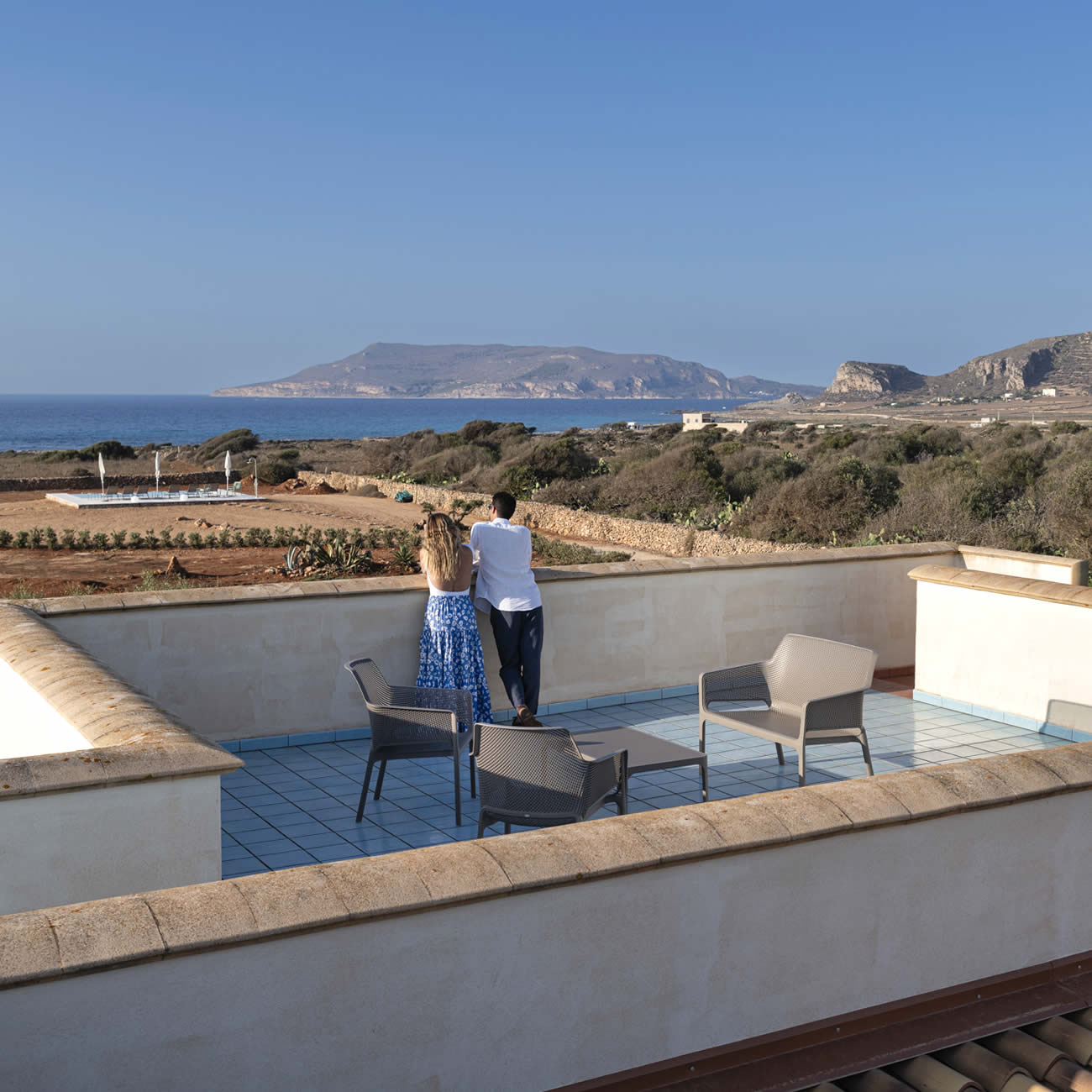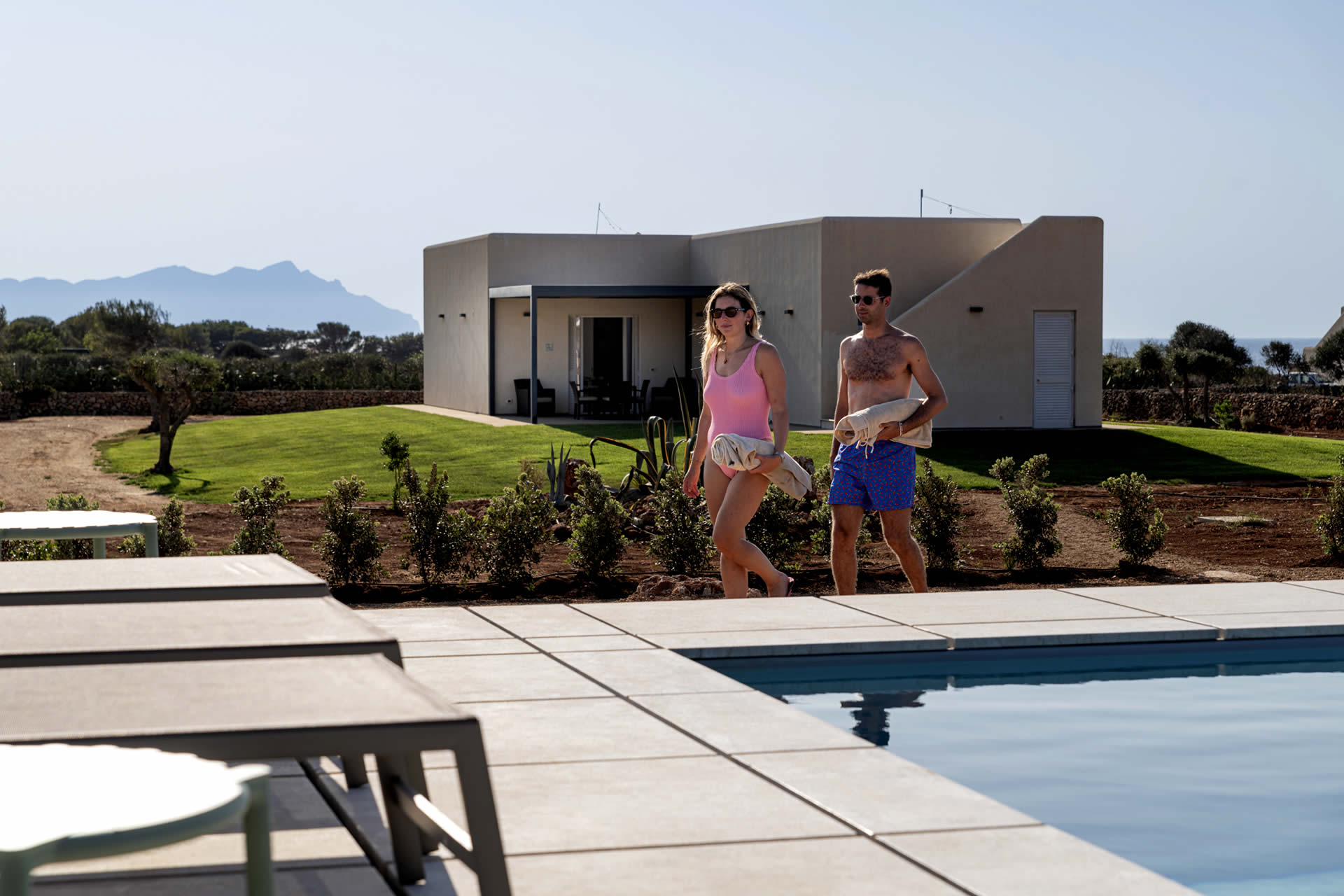 La piscina, condivisa con le altre ville di Cala Virdi, situata a pochi passi da villa Zabbara, gode di una posizione privilegiata con una vista panoramica straordinaria sull'isola di Levanzo e sui tramonti mozzafiato che si riflettono sull'isola di Marettimo, una delle meraviglie naturali dell'arcipelago delle Egadi.